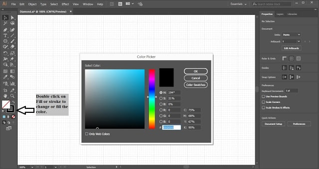 If you remember, in the starting, we had changed the Fill to NO FILL. Now double click on the Fill in the Tool Panel and the Color Picker window will appear. Pick your color from the color picker window and color your diamond.