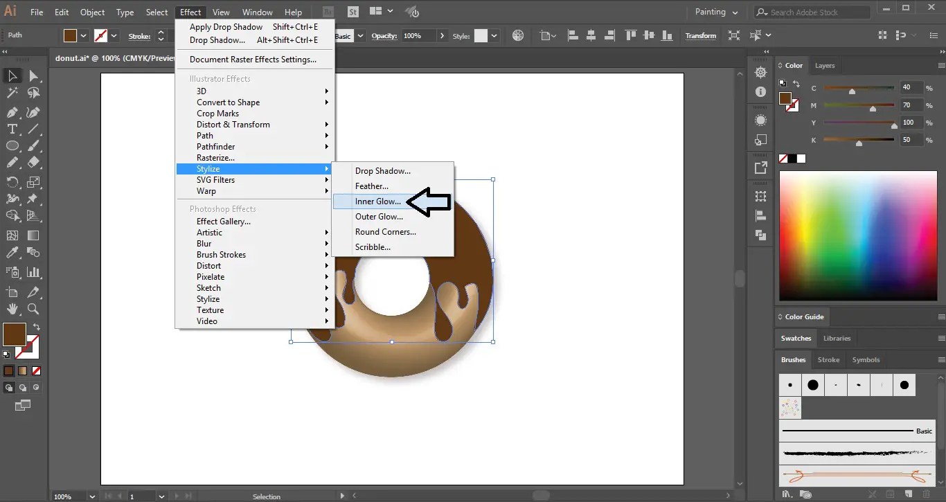 Then select the melted chocolate shape drawn and click on Effect in the Menu Bar. Place the cursor on Stylize and select Inner Glow.